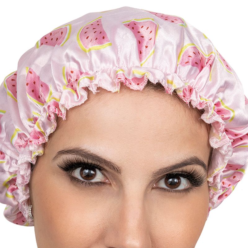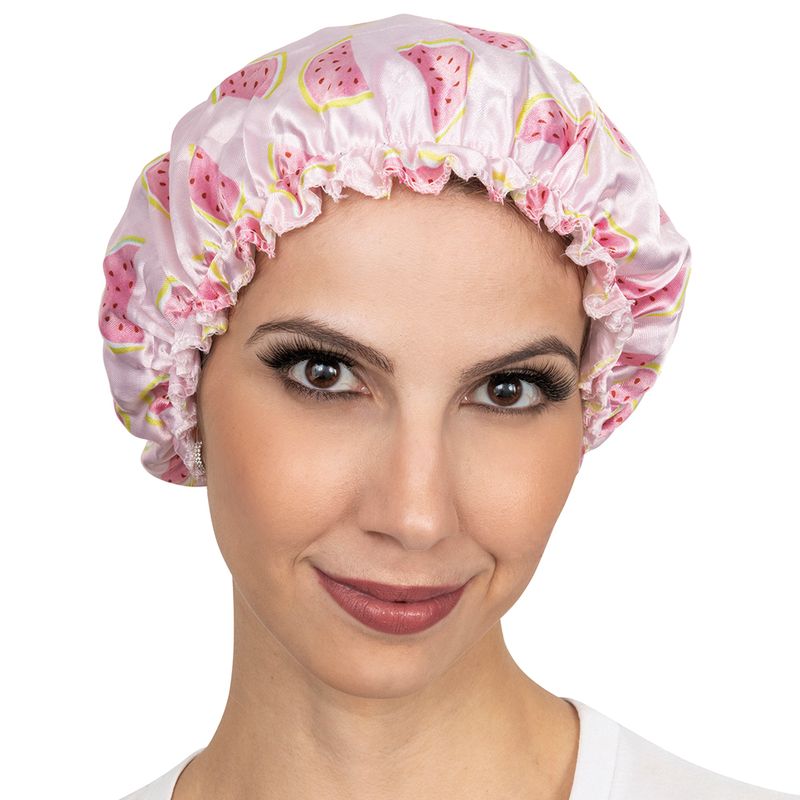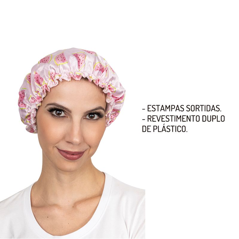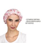 Touca de banho com estampa exclusiva e proteção plástica interna.