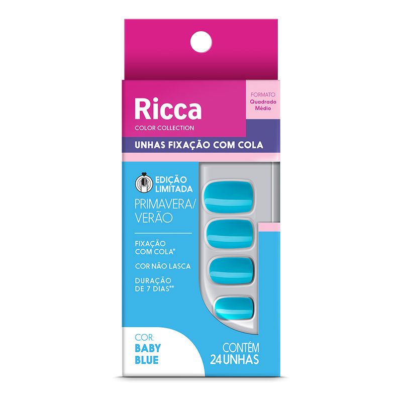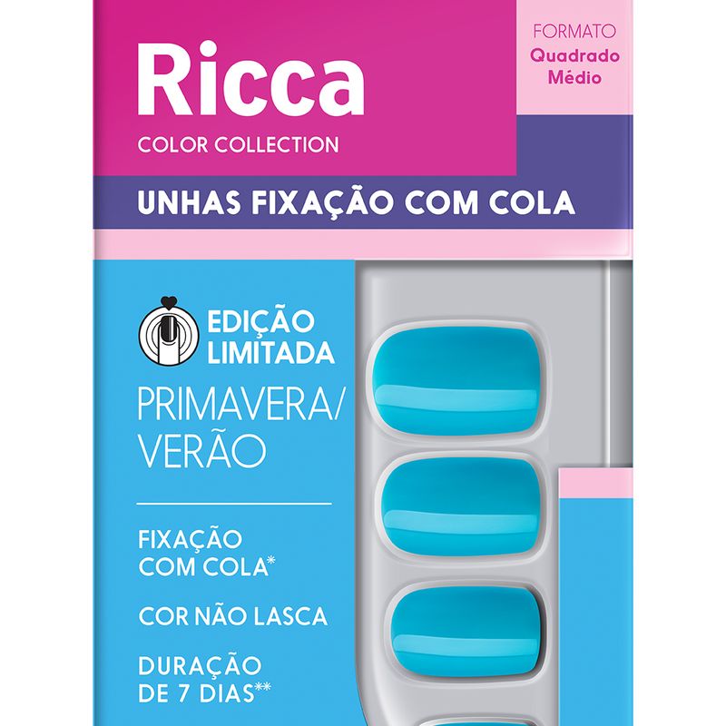Se você está em busca de unhas deslumbrantes que sigam as últimas tendências da moda, as Unhas Ricca Color Collection Primavera Verão são a escolha perfeita para você. Unhas perfeitas com esta Edição Limitada! Esta coleção de unhas postiças Ricca é única e exclusiva, disponível por tempo limitado. Não perca a oportunidade de escolher a cor do momento para se tornar #RiccaLover. Com um formato quadrado médio, estas unhas postiças proporcionam um visual moderno e versátil, se adaptando confortavelmente às suas unhas naturais, criando um visual elegante em questão de minutos. As Unhas Ricca Color Collection Primavera Verão são confeccionadas em plástico flexível e resistente, garantindo uma aplicação fácil e confortável. Além disso, elas possuem cobertura UV, o que faz com que suas cores permaneçam lindas e brilhantes por até uma semana, permitindo que você exiba seu estilo com confiança. Como usar as unhas postiças Ricca: Comece preparando suas unhas naturais, certificando-se de que estejam limpas e secas. Empurre delicadamente as cutículas para trás. Selecione o tamanho de unha postiça que melhor se adapte a cada dedo. Lembre-se de que é importante escolher um tamanho que se ajuste perfeitamente, para um visual natural e confortável. Aplique uma pequena quantidade da cola para unhas postiças Ricca no tamanho escolhido e pressione-a firmemente sobre sua unha natural, segurando-a por alguns segundos para garantir uma fixação segura. Repita o processo para cada unha, garantindo que todas estejam aplicadas de maneira uniforme e alinhadas. Suas novas unhas estão prontas para brilhar! Mostre seu estilo e desfile por aí com confiança. Chega de esperar o esmalte secar ou preocupar-se com lascas e descamações. Com as Unhas Ricca Color Collection Primavera Verão, você terá unhas deslumbrantes com uma paleta para lá de incrível em poucos minutos!
