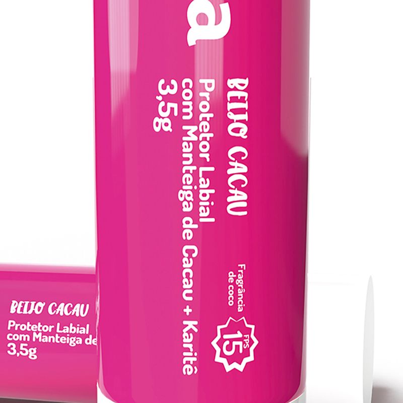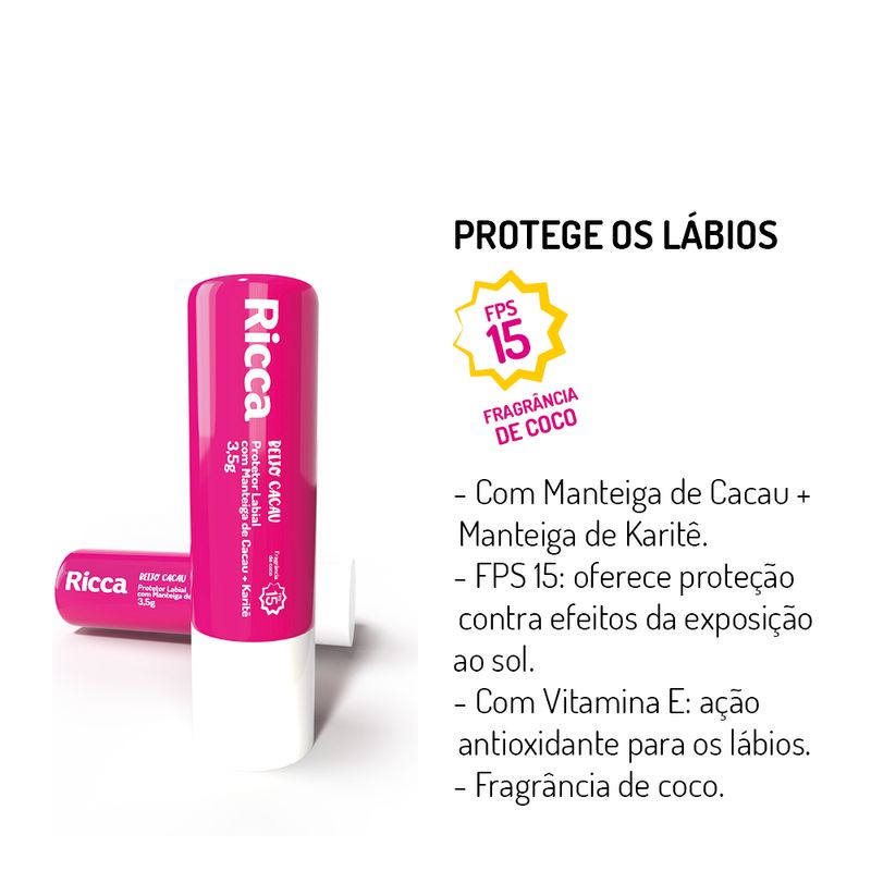 Beijo Cacau é a manteiga de cacau 2.0 . Protetor labial com manteiga de cacau e karitê, para trazer uma super hidratação para os lábios, além do FPS 15, para te deixar protegida. E como Ricca gosta de fazer tudo diferente, o Beijo Cacau tem um delicioso cheiro de Coco.