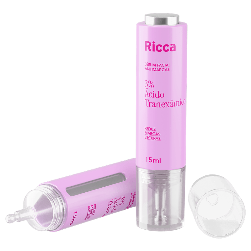 Se tem algo que não precisa te acompanhar são as manchinhas no rosto. O Sérum Ricca Ácido Tranexâmico age rapidinho: já na primeira semana você nota a pele mais uniforme, iluminada e com marcas reduzidas.